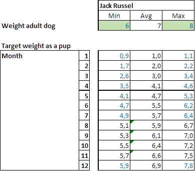 The table of target weights month by month over the first 12 months for a Jack Russel is then as follows: